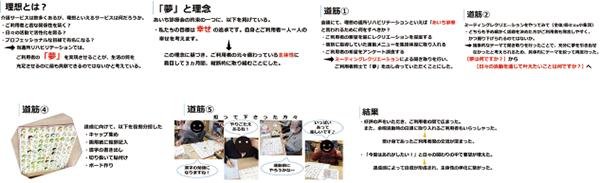 私は今回、ご利用者の主体性に着目した取り組みを発表しました。「夢」は抽象的故にイメージが湧きにくいですが、具体的で現実的な「目標」を定め、達成することでご利用者の主体性が伸び、笑顔が増える結果となりました。その積み重ねが「夢」を持つことに繋がればいいなと考えています。