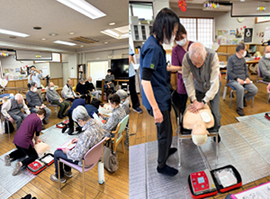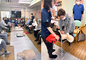 野並通所リハビリテーションでは、利用者様はもちろん自分たちの安全を守り、安心して日々の生活ができる環境づくりを行うため、利用者様と職員合同で一次救命処置について学ぶ講習会を受講しました。
